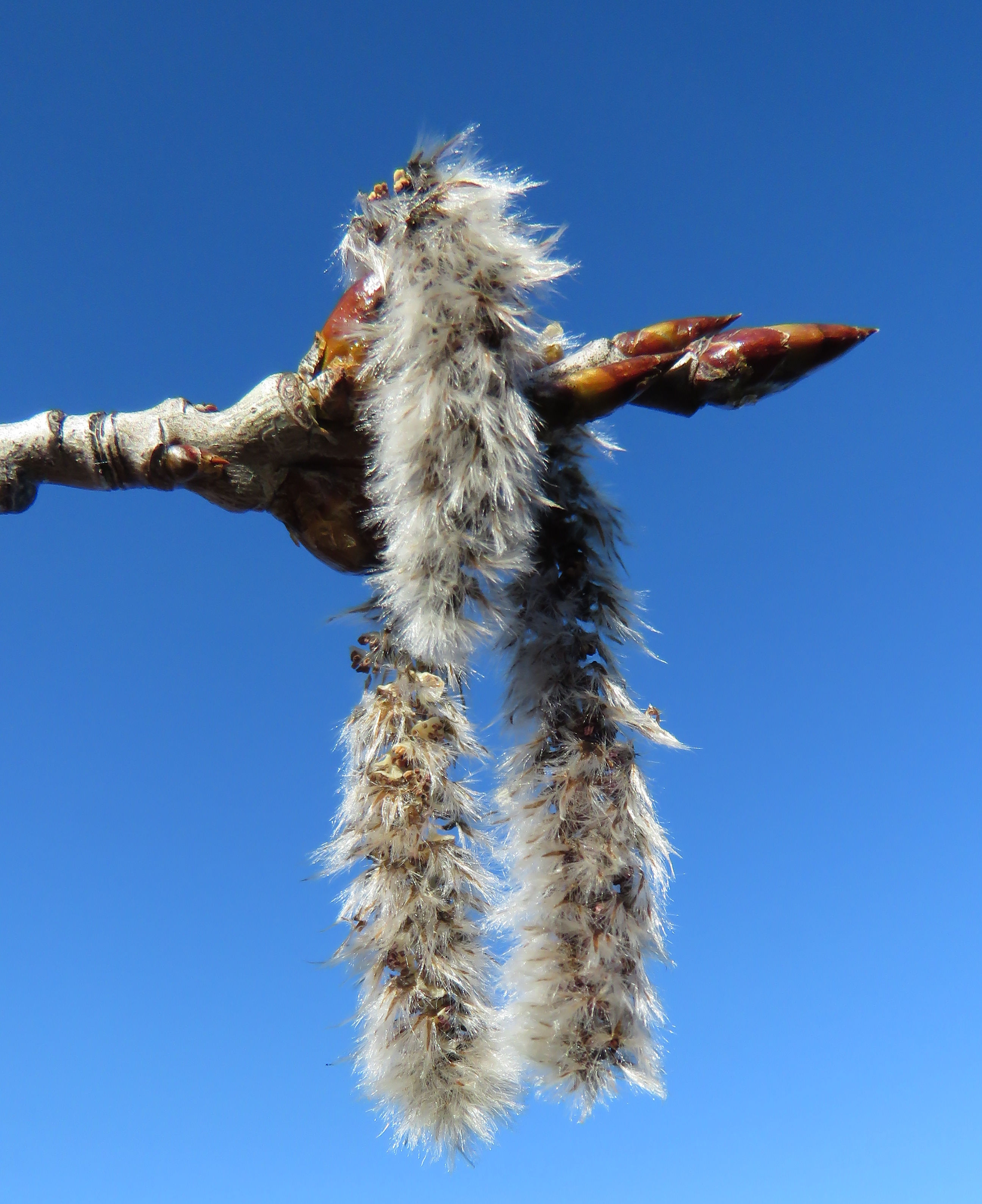 All members of the Salicaceae bloom in early spring, some before all the snow has melted.  Species are dioecious, meaning there are normally separate male and female trees.  Like the oak family, aspen flowers form in catkins.